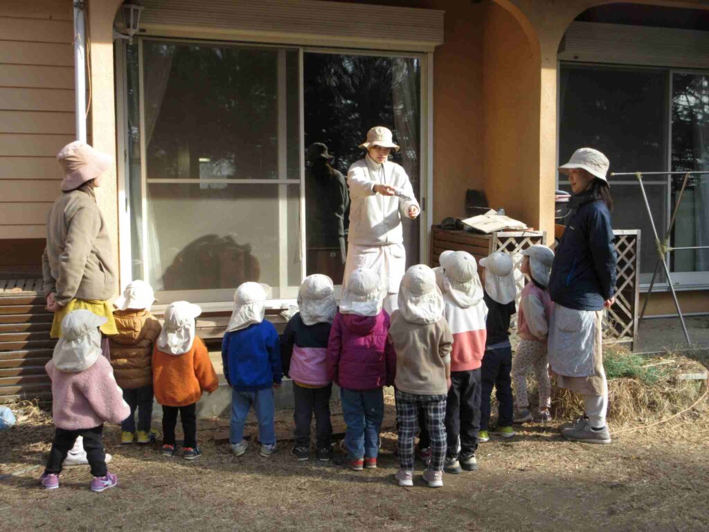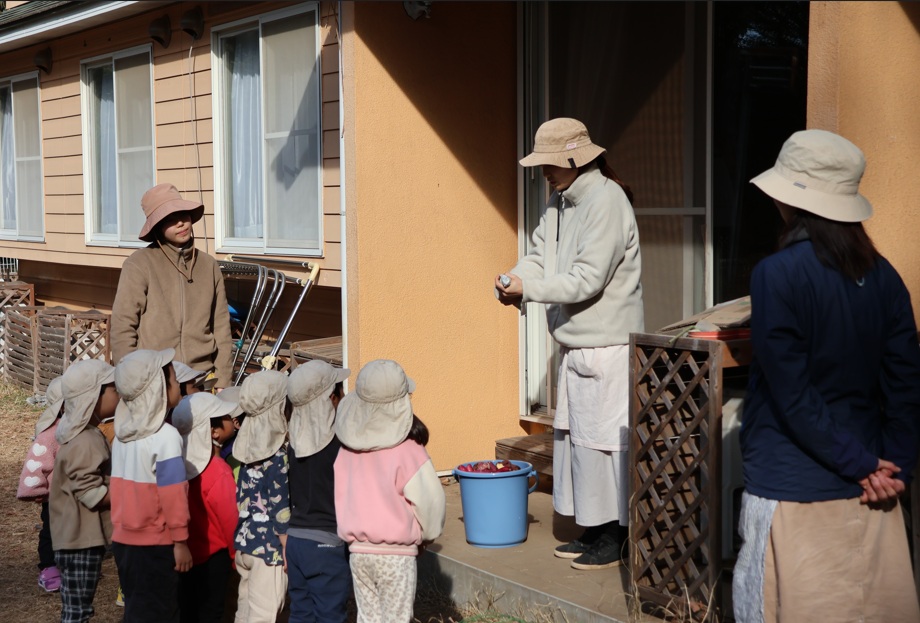 (↑1~4歳児クラス、いもの準備の仕事をします。事前説明中。)