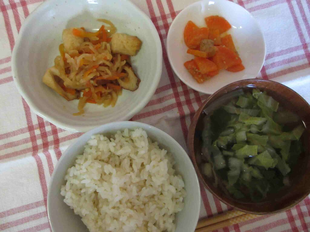 ・五分つきごはん ・ちくわと切り干し大根の煮物 ・白菜とわかめの和風スープ ・にんじんのごまみそ炒め