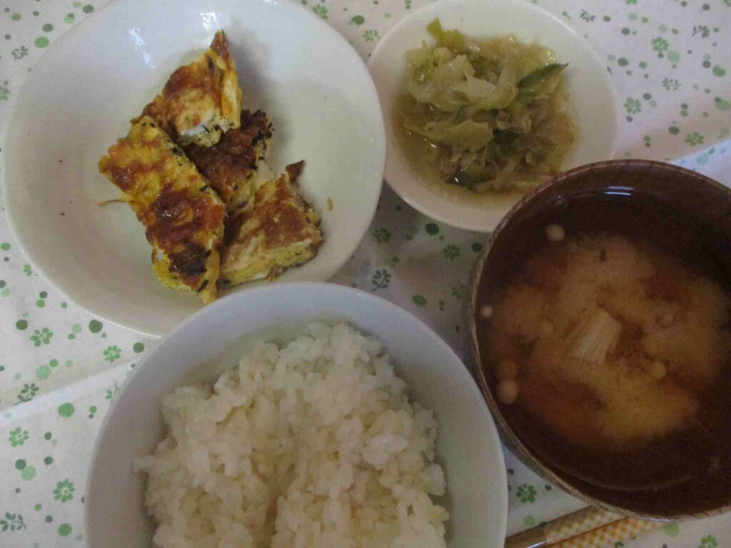 ・五分つきごはん ・ひじき入り卵焼き ・きのこのおみそ汁 ・キャベツのそぼろ煮