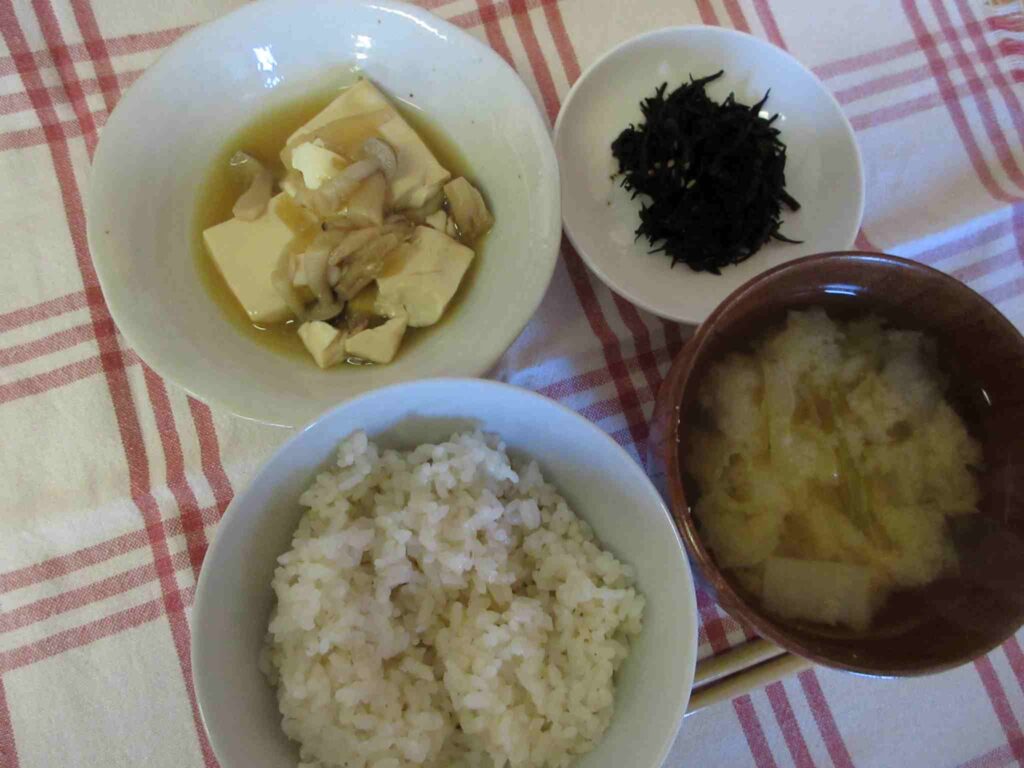 ・五分つきごはん ・豆腐としめじ・玉ねぎの煮物 ・白菜のおみそ汁 ・ひじきの甘辛煮