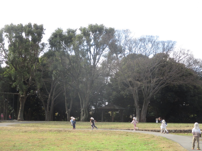 今日は2人のお母さまが保育参加に来てくださいました。絶好のお天気の中、全員で姥山貝塚公園へ歩くお散歩です。