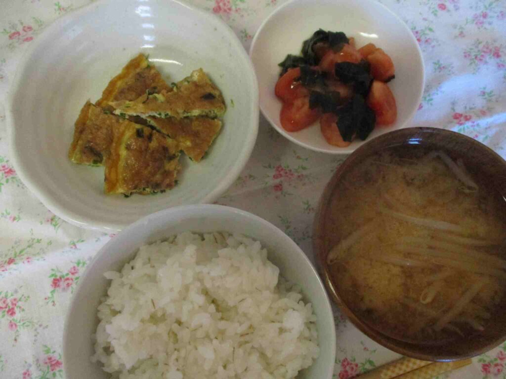 ・麦ごはん ・にらとひき肉の卵焼き ・もやしのおみそ汁 ・トマトとわかめの甘酢和え