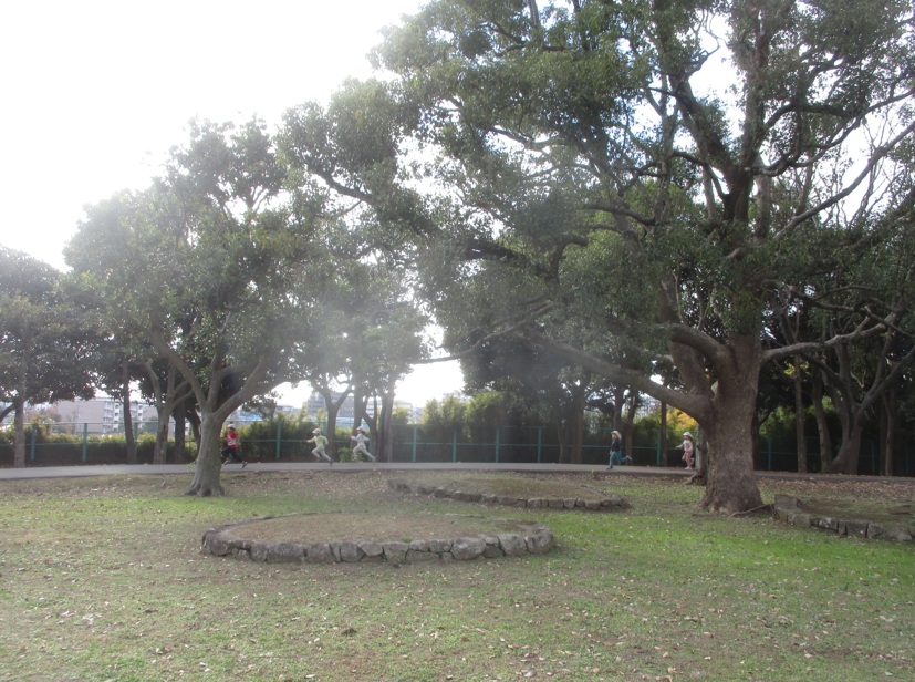 公園に着いて、軽めのマラソンを2周。3歳児クラスは気付くと後列に行きがち。先生たちから声援が送られます。2歳児クラスNくんもぐんぐん前へ食い込み、半泣きになりながらもちゃんと参加してくれました。