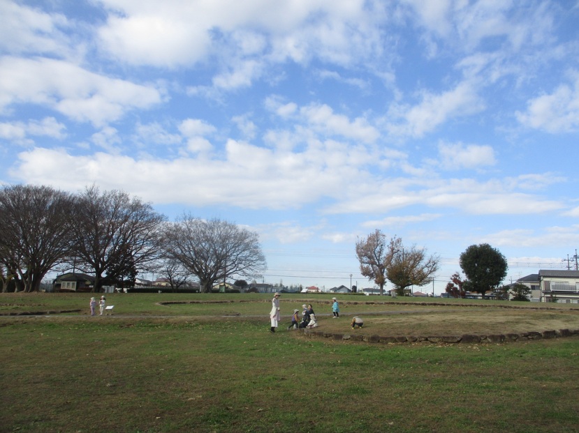 今日は2人のお母さまが保育参加に来てくださいました。絶好のお天気の中、全員で姥山貝塚公園へ歩くお散歩です。