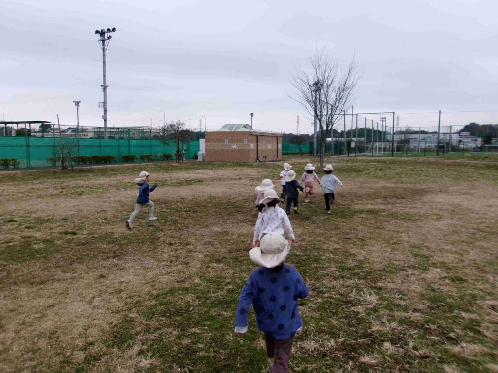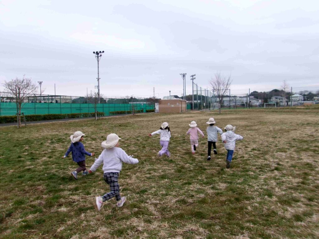 1~2歳児クラスは、Nちゃん・Nくんがスポット参戦。他の子もゆるく体を動かし続け、寒さの限界が来る前に帰りました。