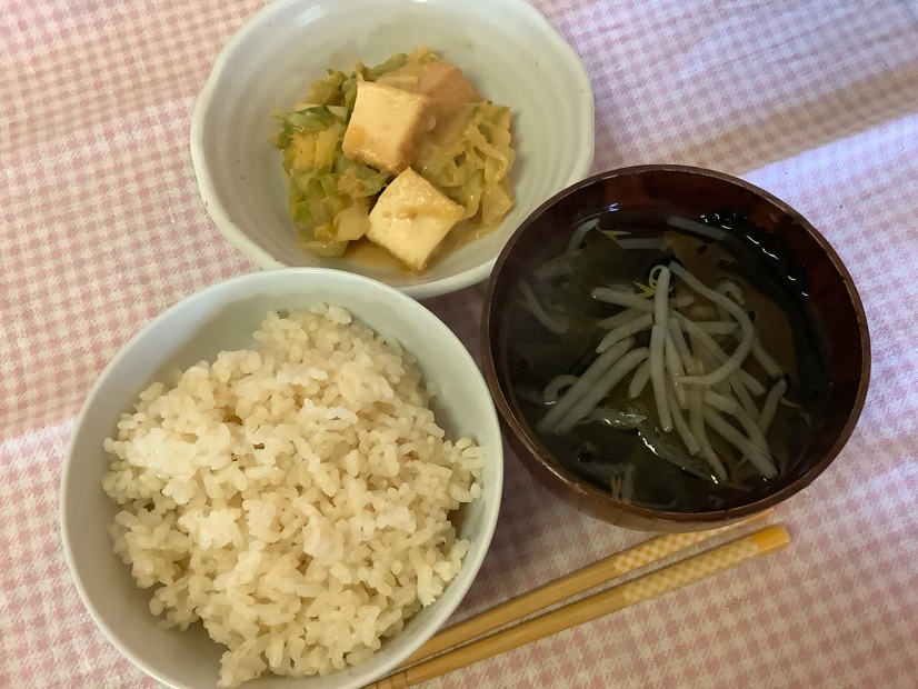 ・五分つきごはん ・厚揚げとキャベツのみそ炒め ・もやしとわかめの和風スープ