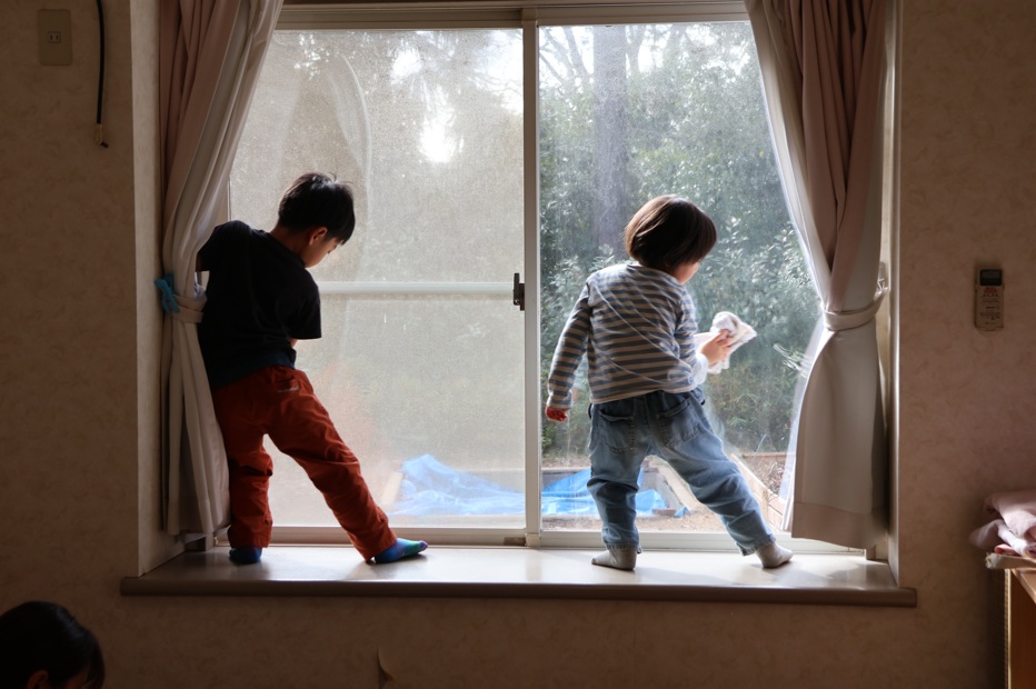 (途中、4・5歳児クラスがM先生と順番に抜けて、自分たちの部屋の棚と窓をそうじしました。)