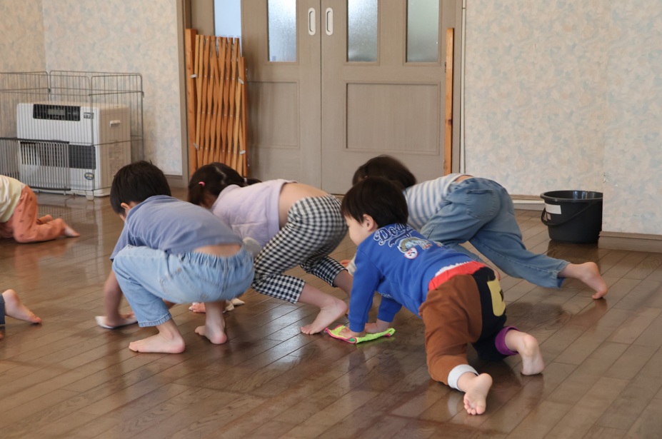 多くの子がカエルの足の運びでふき始めましたが、それを見た2歳児クラスIくんが、ぞうきんを持ったままカエルジャンプを繰り返すのも何とも微笑ましく(笑)。