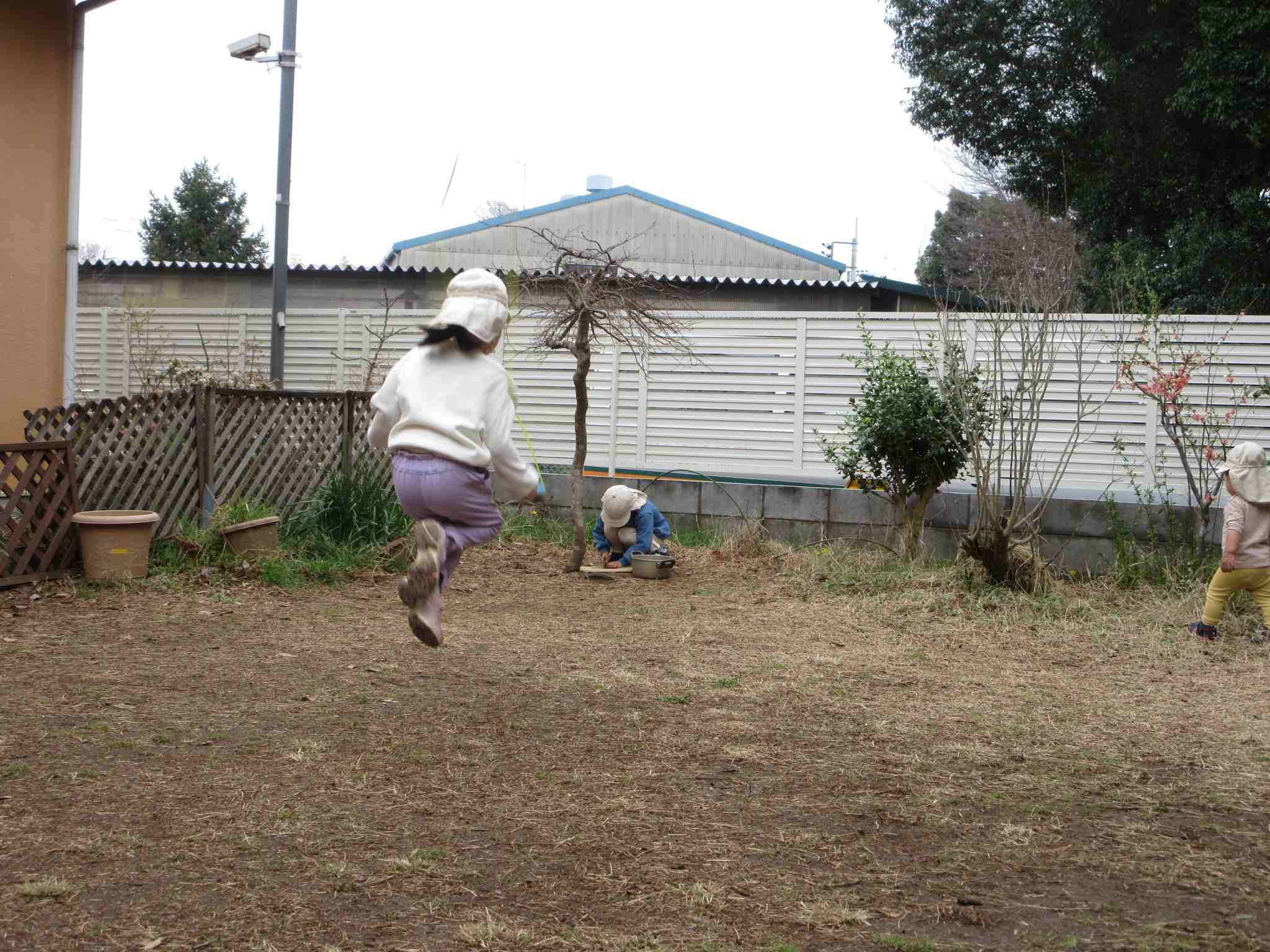 園庭でFちゃんがひとりでなわとびをやっていたので、「二重跳びをやってみない?」と声をかけてみたところ快諾してくれ、練習がスタートしました。