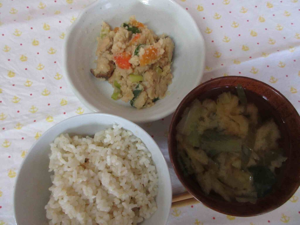 ・五分つきごはん ・キャベツと小松菜のおみそ汁 ・炒りおから(鶏もも肉・油あげ・にんじん・ねぎ・干ししいたけ)