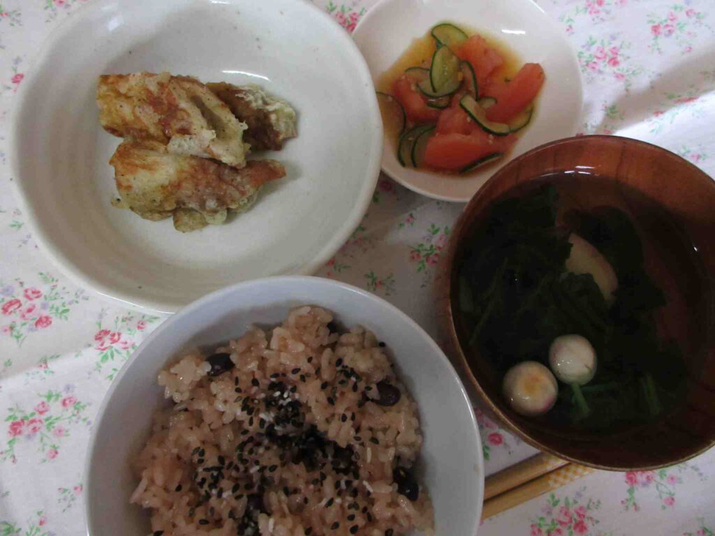 ・お赤飯 ・ちくわの磯辺揚げ ・お吸い物(ほうれん草・わかめ・かまぼこ・てまりふ) ・トマトときゅうりのナムル
