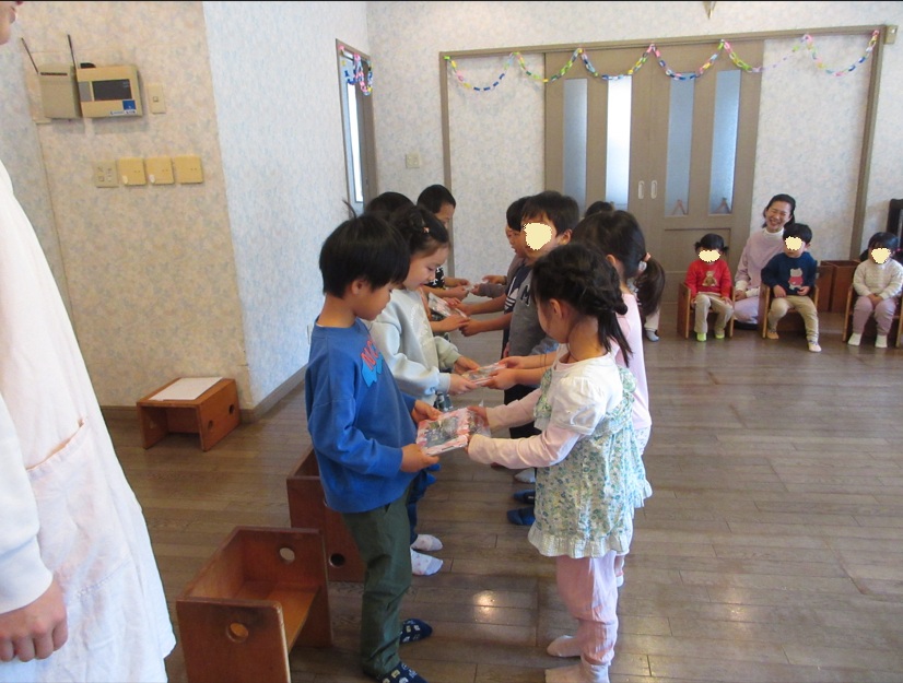 そら組の5人も、気持ちを込めて贈呈。昨日から渡す練習をしていたので、「そつえんおめでとう」のセリフもばっちり!