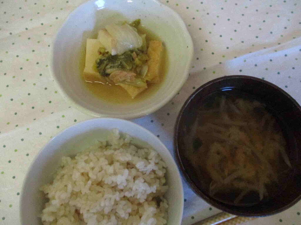 ・五分つきごはん ・厚揚げと白菜のツナ煮 ・もやしのおみそ汁