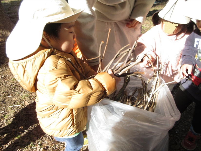 この時期に枝を集めることは例年まず無く(やきいも大会を年を越して2月にやることが初めてなので)、どれぐらいあるか未知でしたが、心配を余所にたくさんのよく乾いた枝がゴロゴロ! みんなで一斉に収集。