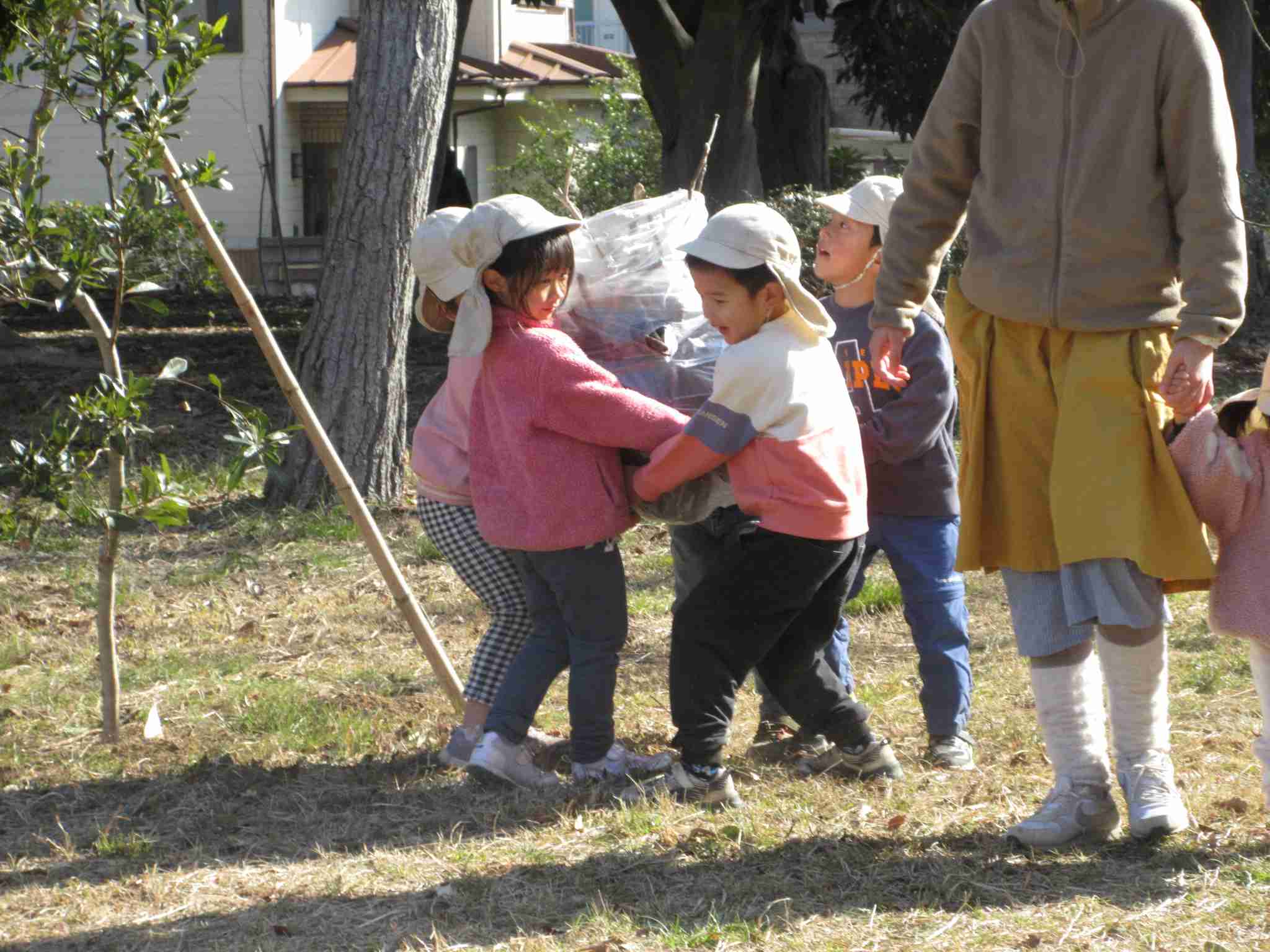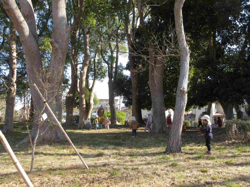4・5歳児クラスは、少し離れたところまで”大物”を探しに行ってもOKにすると、瞳をキラキラ輝かせてものすごいスピードで枝を集めてくる4・5歳児クラス男子たち。