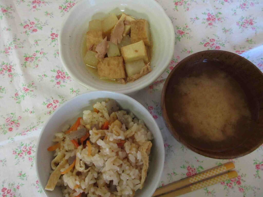 ・関西風炊き込みごはん(油あげ・こんにゃく・にんじん) ・厚揚げと大根のツナ煮 ・コーンと枝豆のおみそ汁