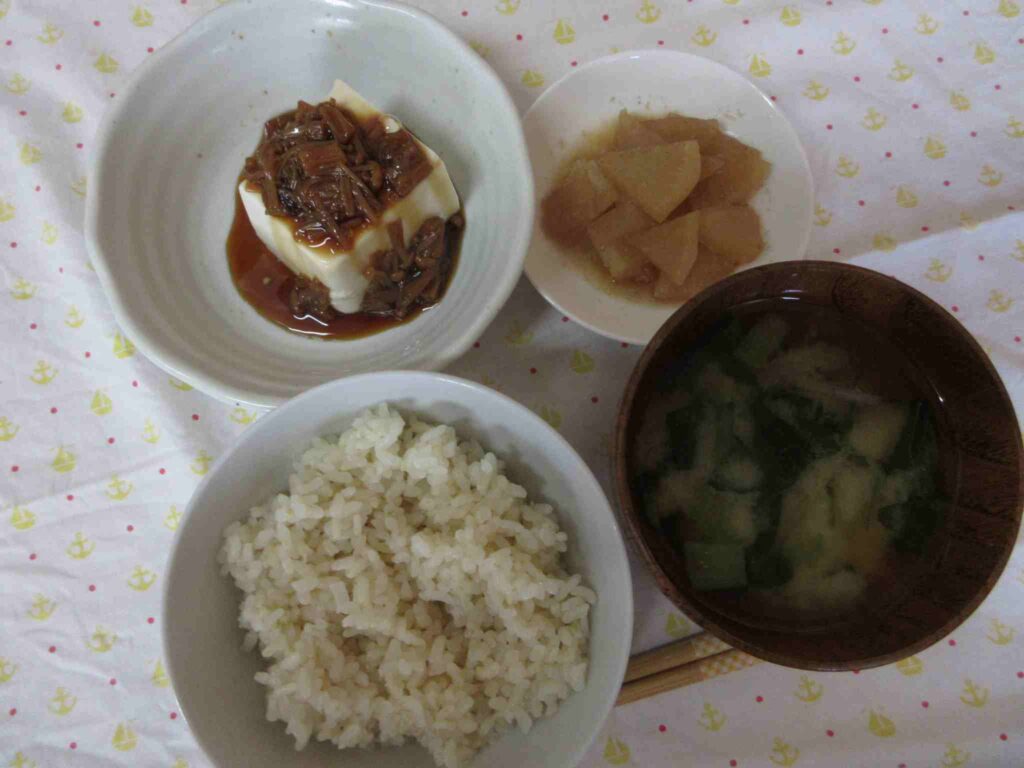 ・五分つきごはん ・冷奴(手作りなめたけのせ) ・小松菜と玉ねぎのおみそ汁 ・大根のごま煮