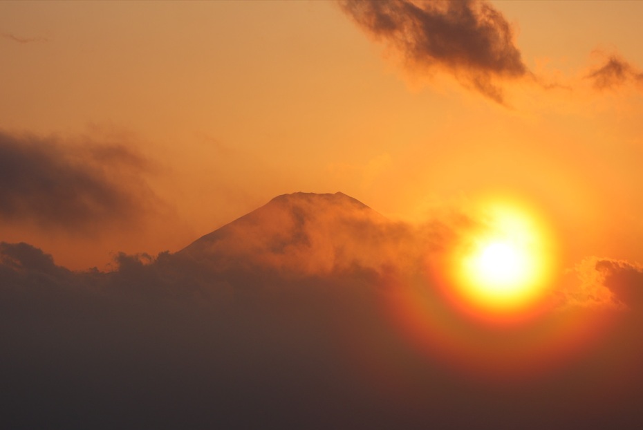(↑富士の裾野に夕日が沈む)