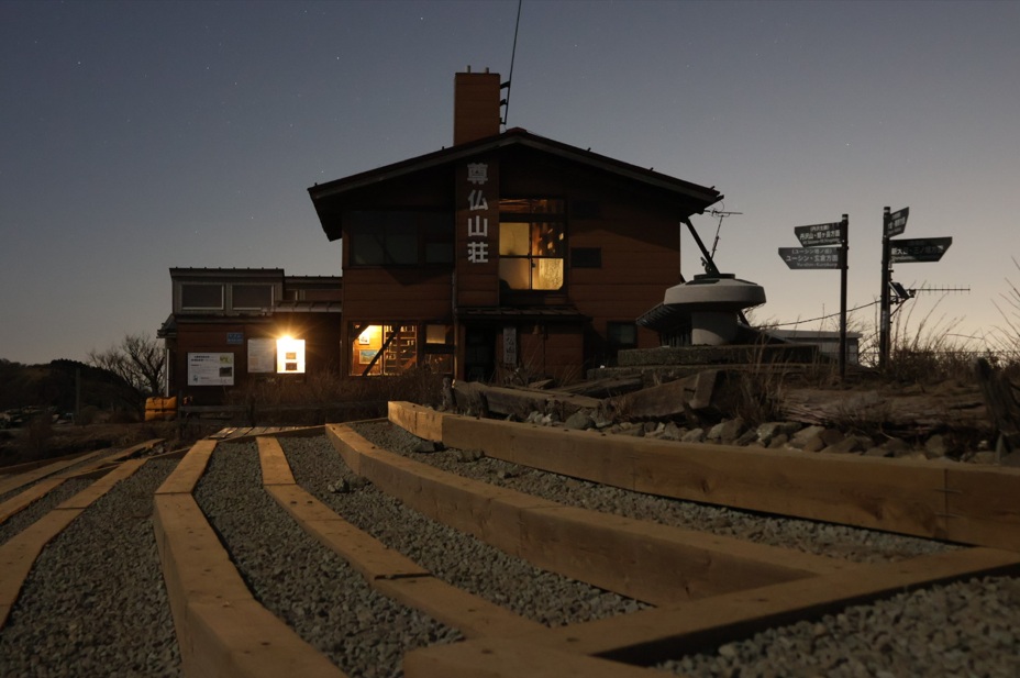 (↑山頂の山小屋、尊仏山荘。時刻は夜中1時。実際は真っ暗です。)