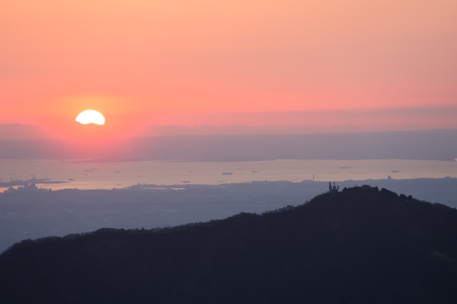 (↑2日目の日の出。手前に見える山は、5歳児クラスのみんなと登った大山。その奥は横浜港と東京湾。その奥は房総半島。)