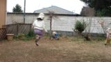 (↑その後は、最近の定番”かわり鬼”。ボールを持つ手前の2人が鬼です。隣のAちゃんは”おまめ”参加。)