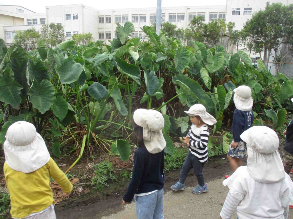 1m幅ぐらいでアスファルトが湿って色が変わっている所を見つけると、そこをとびこえる遊びが始まったり、学校の高校生とフェンス越しにあいさつをして交流したり、Kくんが草摘みに夢中だったり、その場限りの遊びが楽しいです。