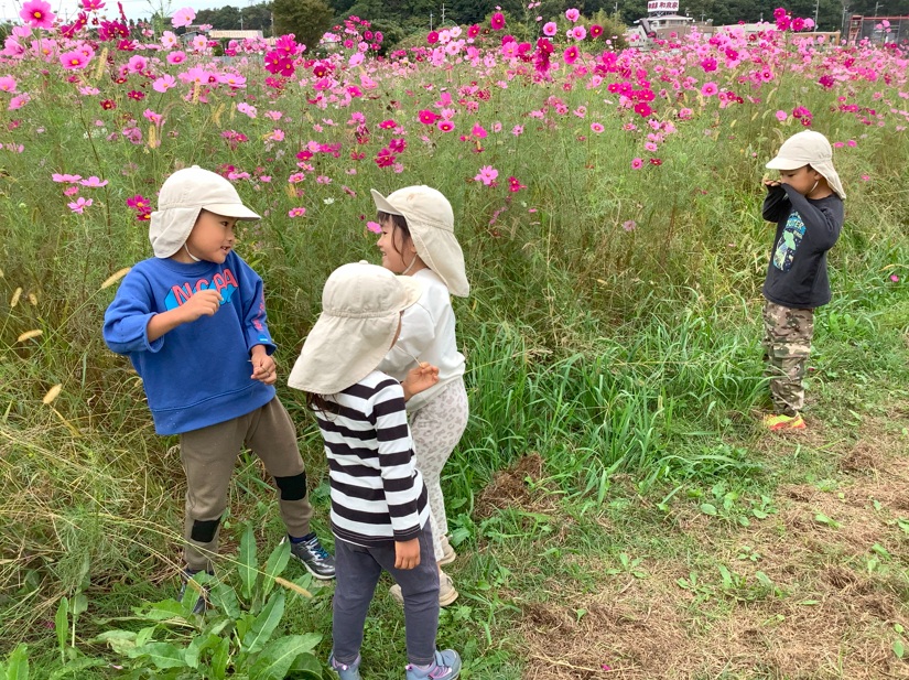 コスモス畑もなかなか素敵。眺める子、散った花びらを帽子のつばに集める子、ただ空き地を走り回る子など様々でした。