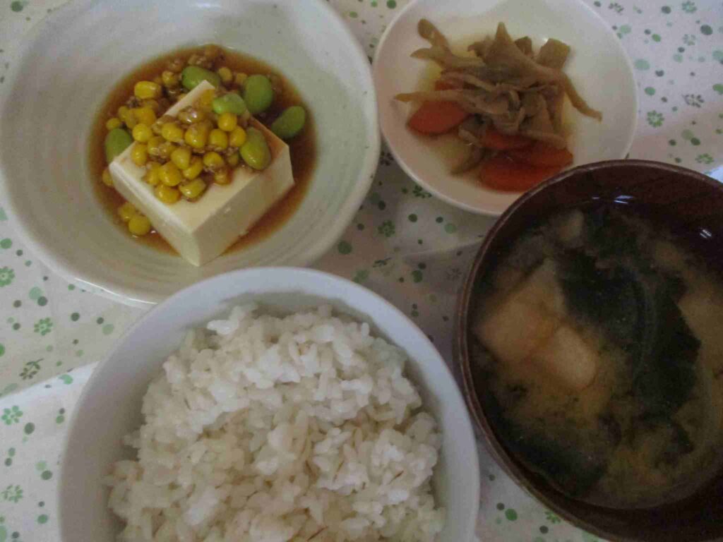 ・麦ごはん ・冷奴(コーンと枝豆のナムルのせ) ・わかめとおふのおみそ汁 ・まいたけとにんじんの煮物