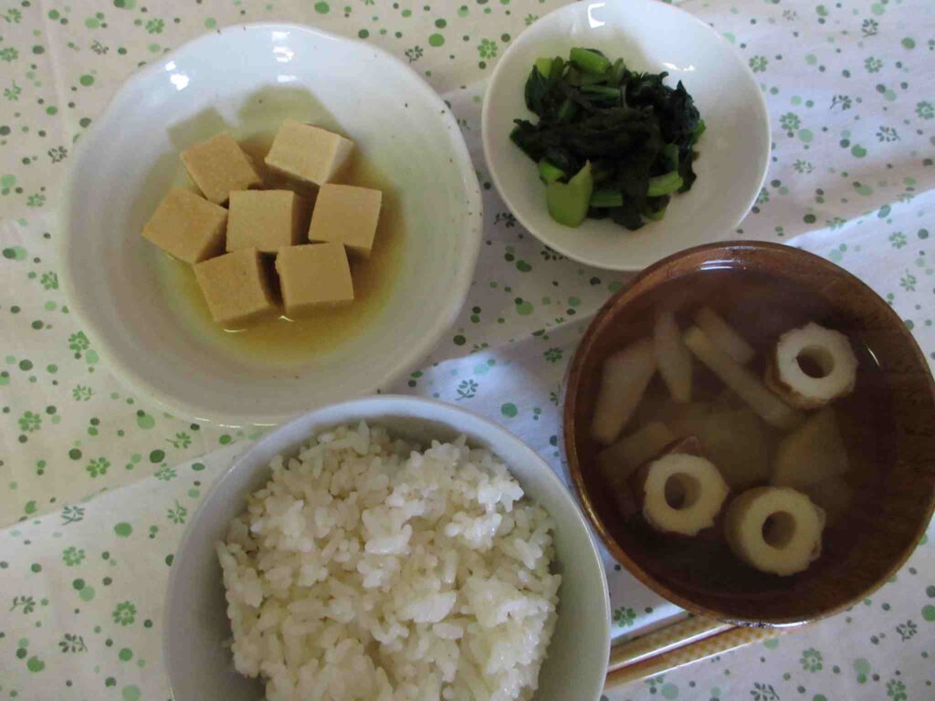 ・五分つきごはん ・高野豆腐のみそ煮 ・ちくわと大根の和風スープ ・小松菜の磯香和え