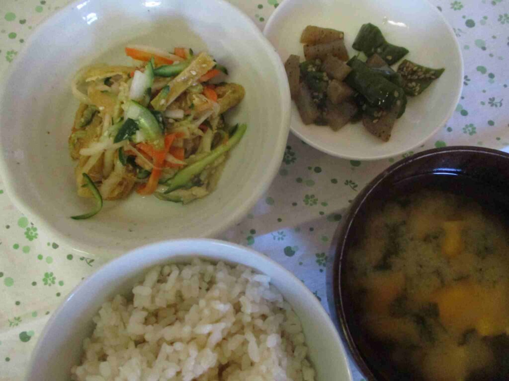 ・五分つきごはん ・油あげと千切り野菜のサラダ ・ピーマンとこんにゃくのきんぴら ・にらと豆腐のおみそ汁