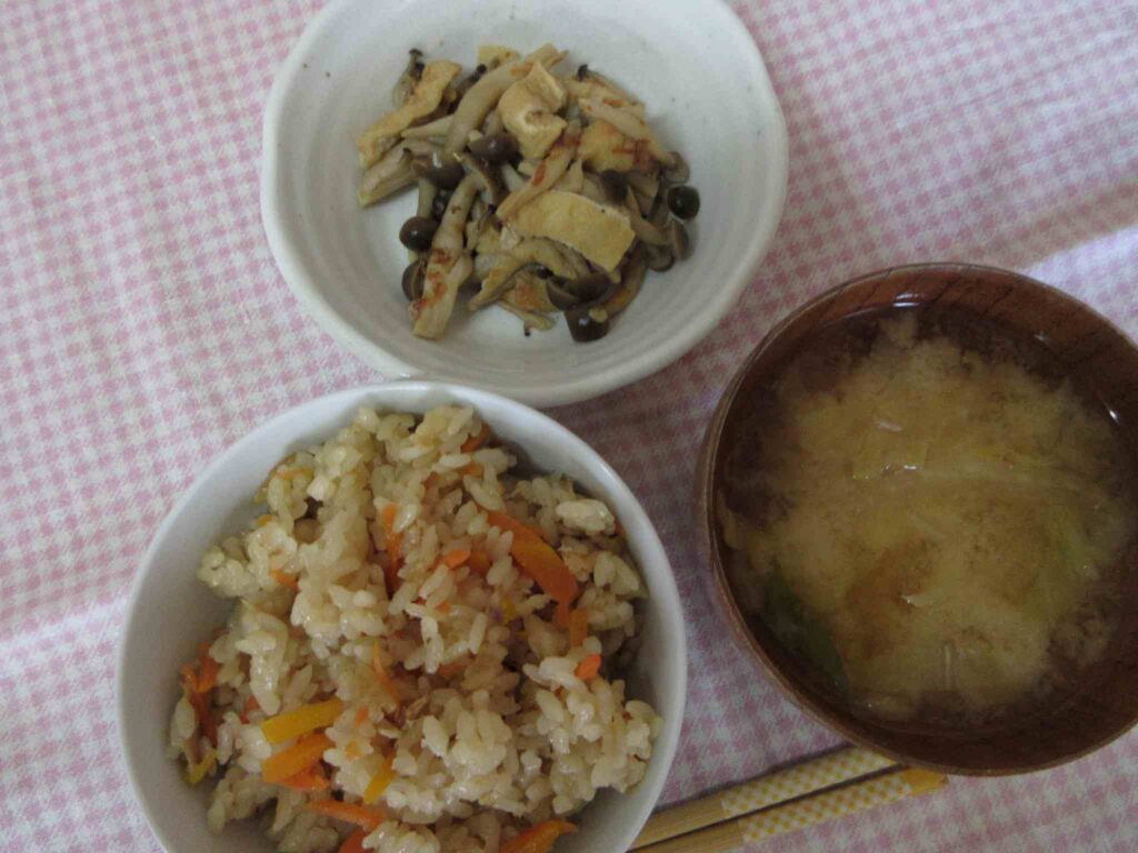 ・にんじんとツナの炊き込みごはん ・油あげときのこの土佐煮 ・白菜のおみそ汁