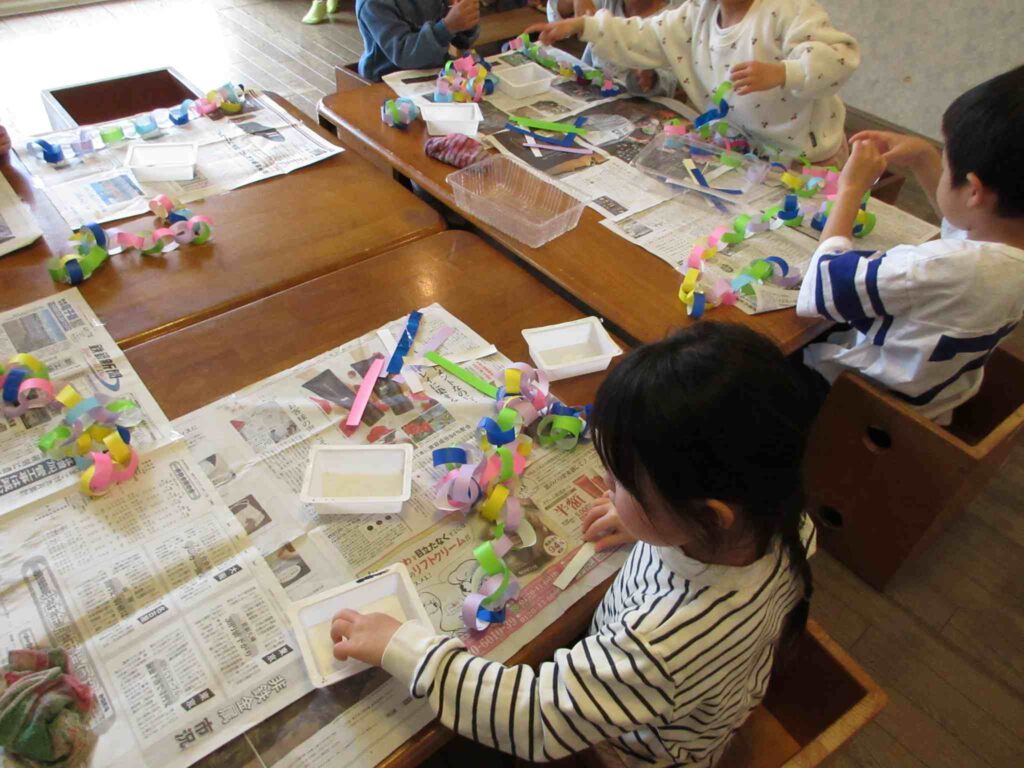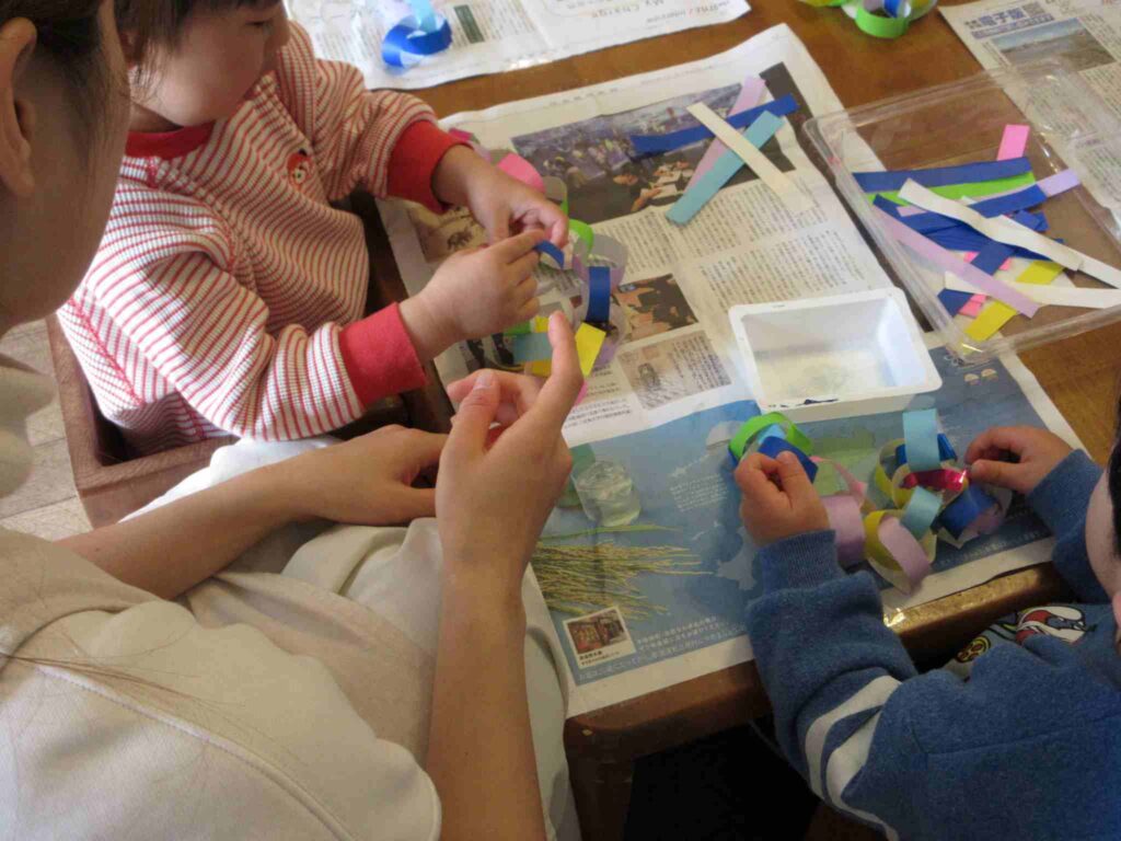 (↑0~3歳児クラス、室内装飾のための輪飾りづくり。)