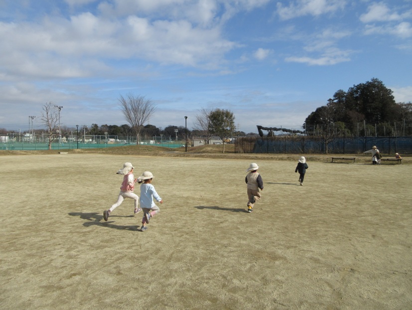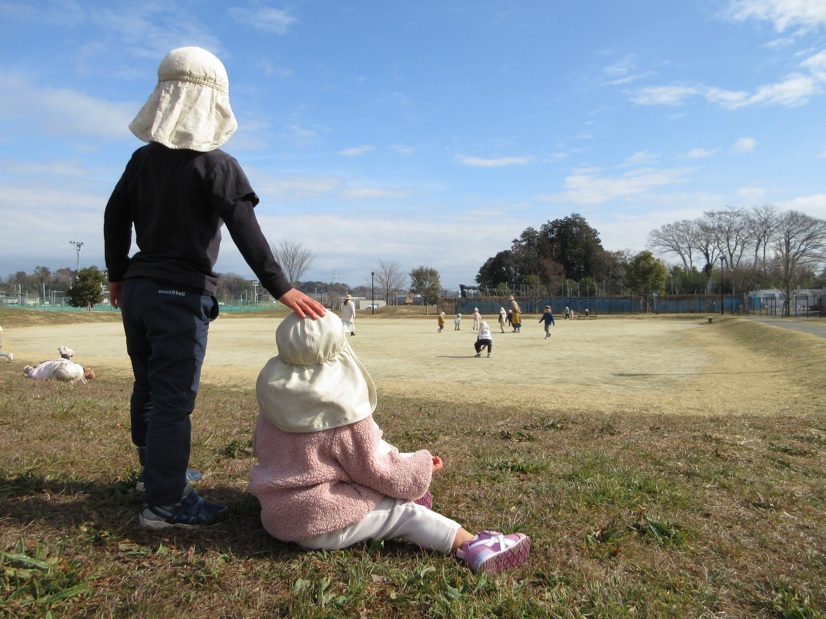 Kくんはみんなの様子を観察。2歳児クラスが自然と「走ろうよー!」と集まり多くのベンチをタッチしに走りに行く光景もすてきでした。