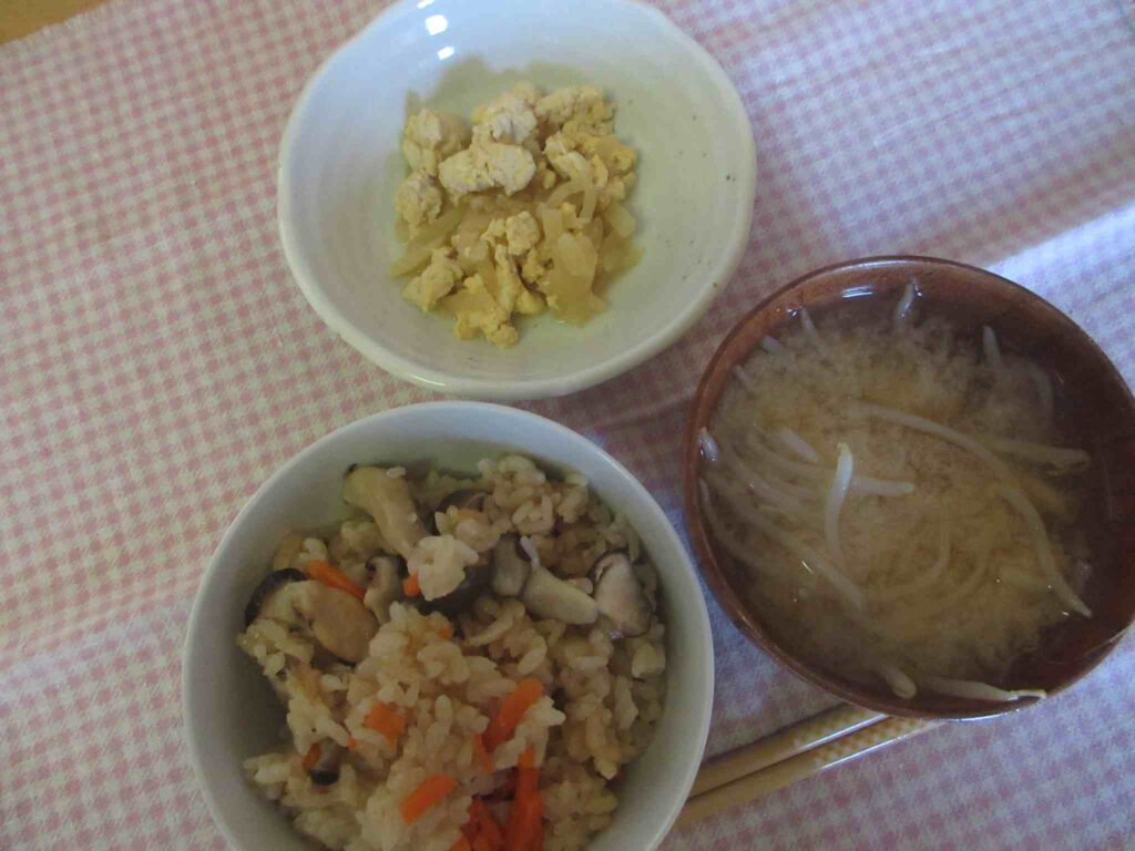 ・きのこ尽くし炊き込みごはん(エリンギ・しめじ・しいたけ・にんじん) ・大根入り炒り豆腐 ・もやしのおみそ汁