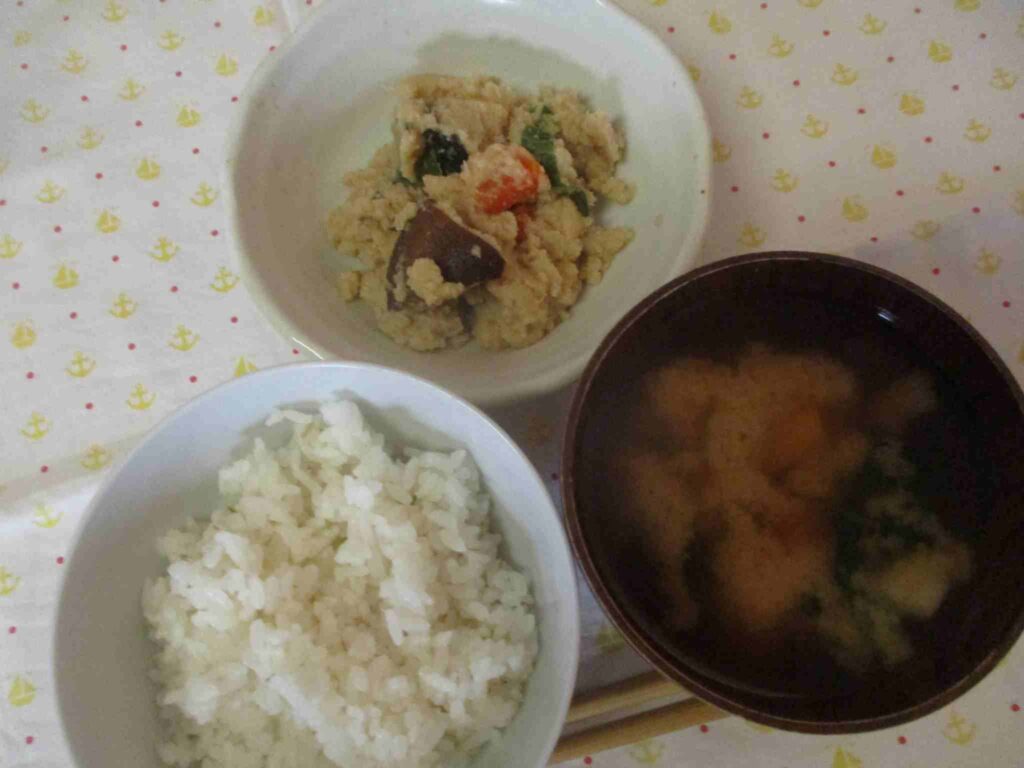・麦ごはん ・豆腐としめじ・小松菜のおみそ汁 ・炒りおから(鶏もも肉・油あげ・にんじん・干ししいたけ・ねぎ)