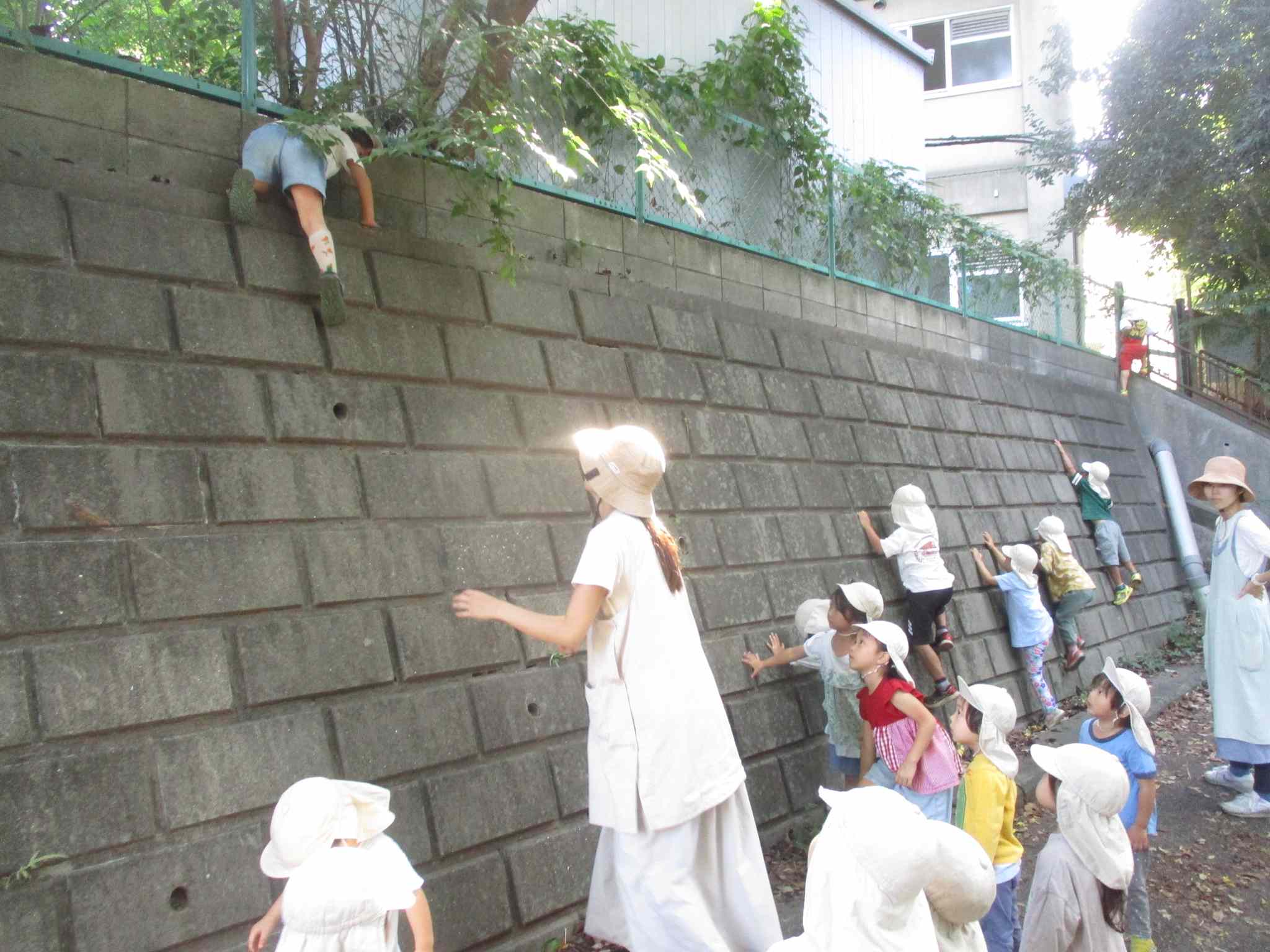 そのまま進むと、大柏小の裏門に出ます。その横の壁登りが今日メインの遊びです。
