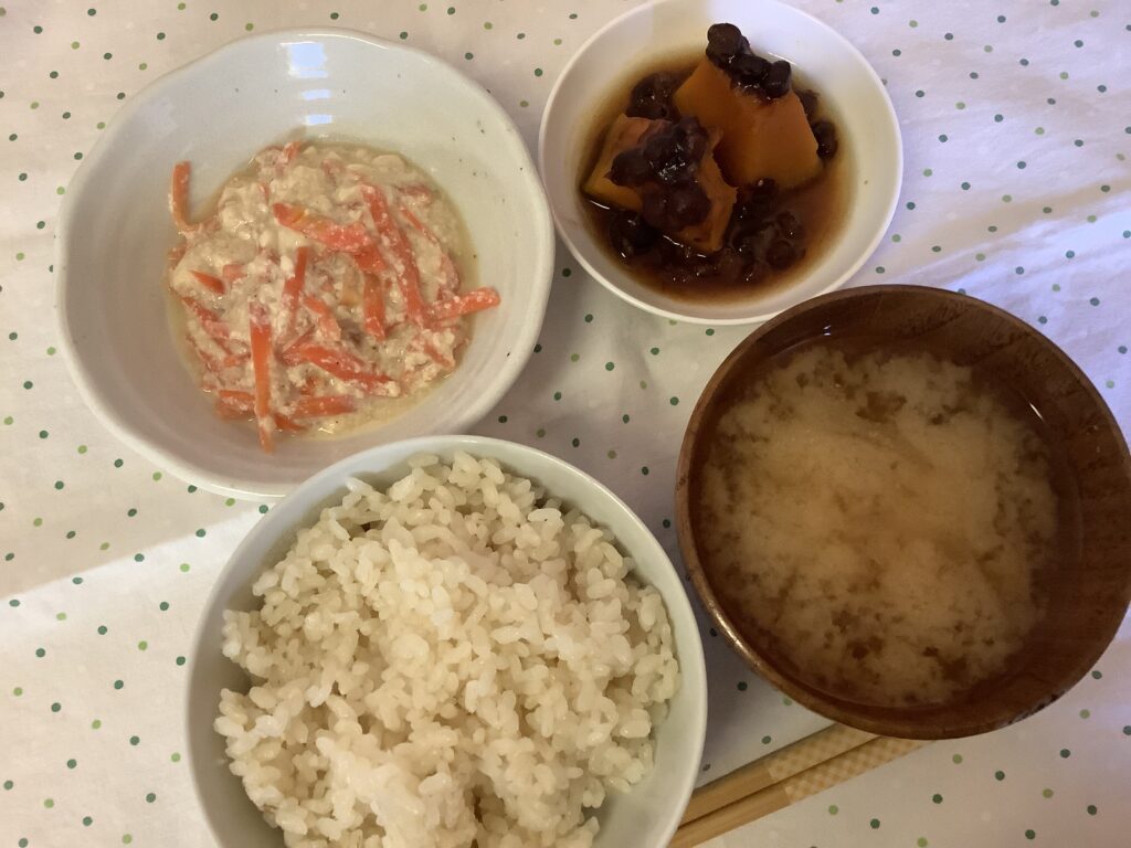 ・五分つきごはん ・にんじんの白和え ・コーンと玉ねぎのおみそ汁 ・かぼちゃのいとこ煮