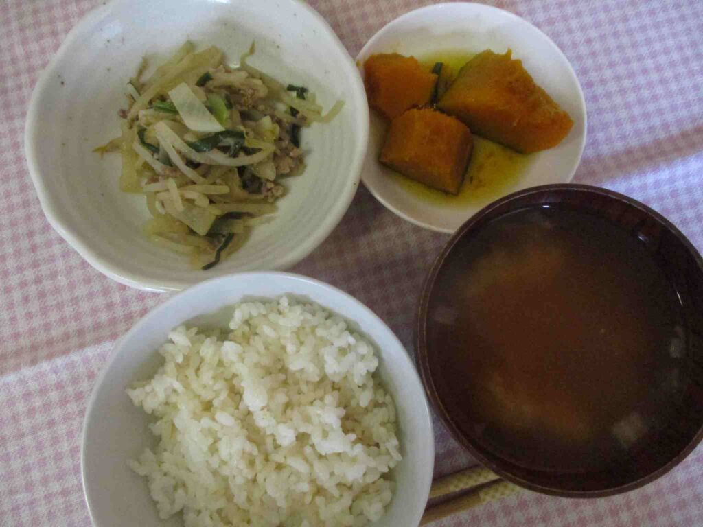 ・五分つきごはん ・もやしとにらのそぼろ炒め ・納豆汁 ・かぼちゃの煮つけ