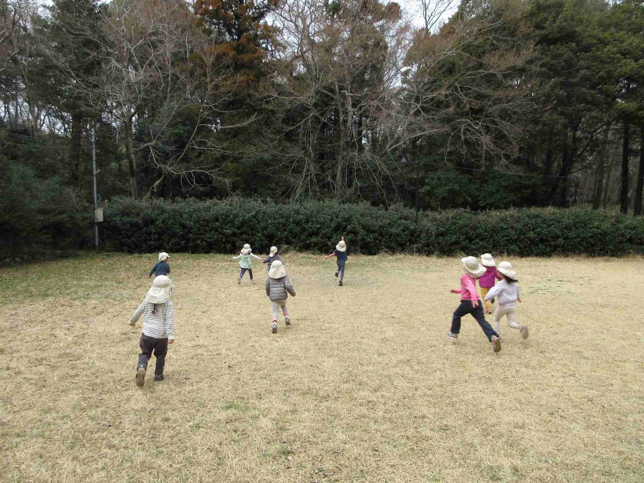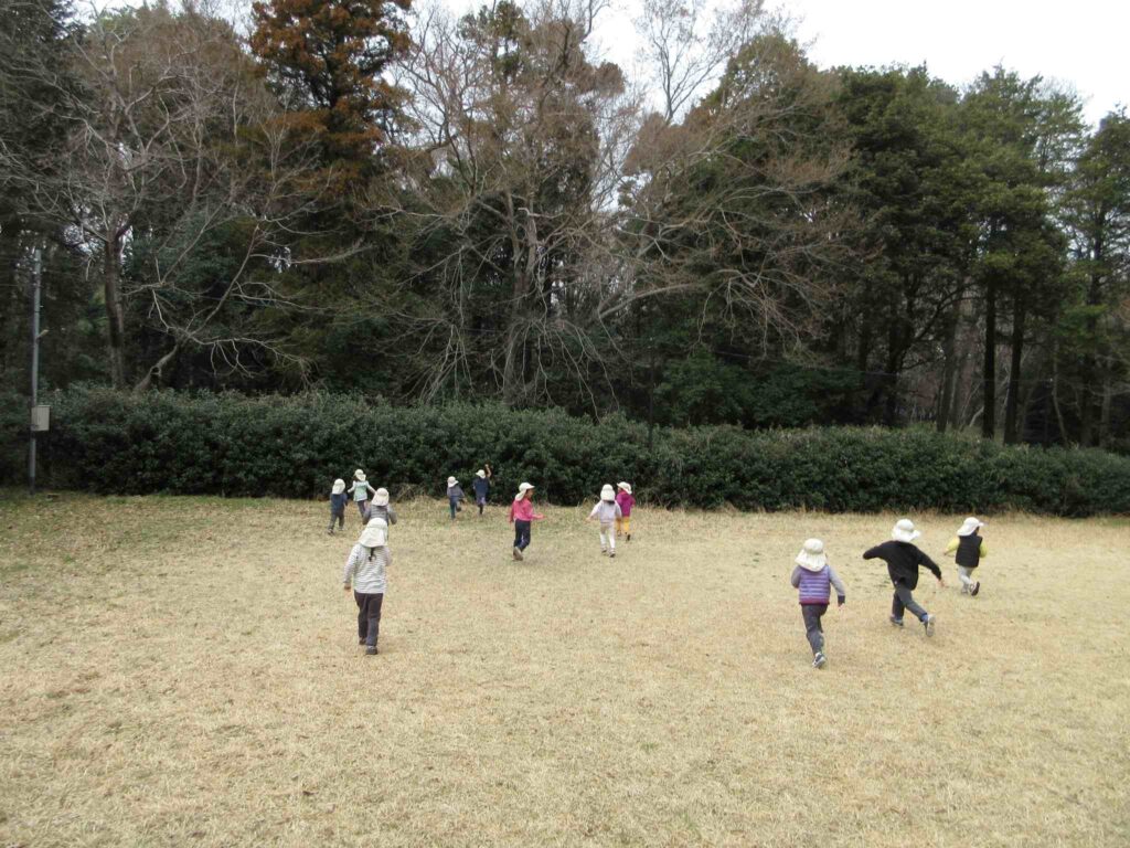 今日も芝生ゾーンで過ごしましたが、メインの遊びは、3・4歳児クラスの多くの子+佐田で「ハンカチ落とし」。