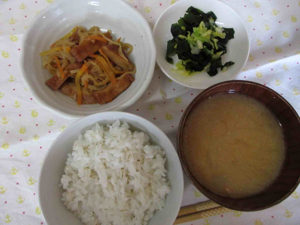 ・麦ごはん ・さつまあげと切り干し大根の煮物 ・納豆汁 ・キャベツとわかめのもみ漬け