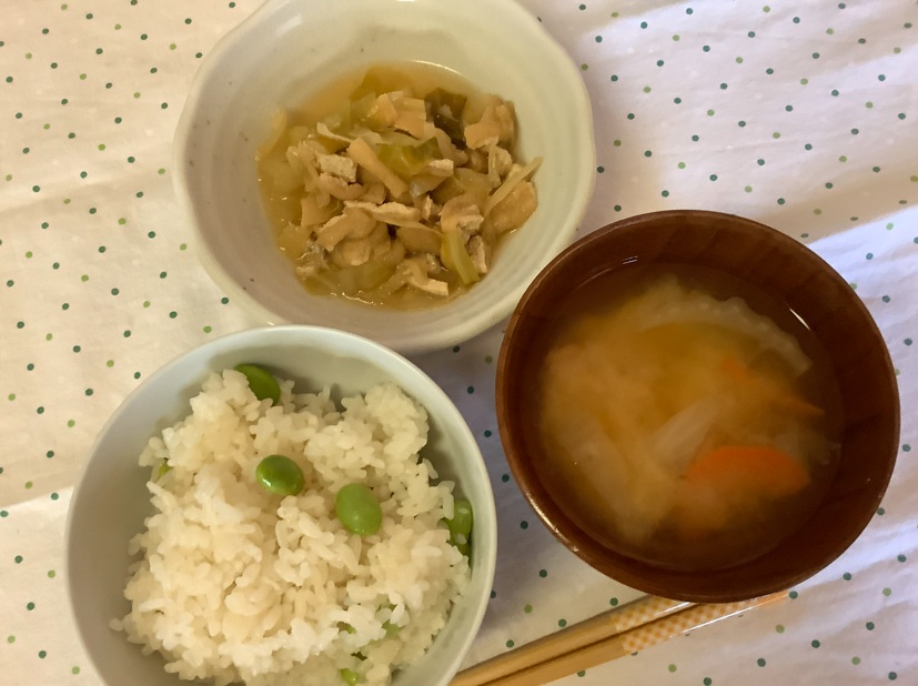 ・枝豆ごはん ・油あげとキャベツの煮物 ・大根とキャベツのおみそ汁