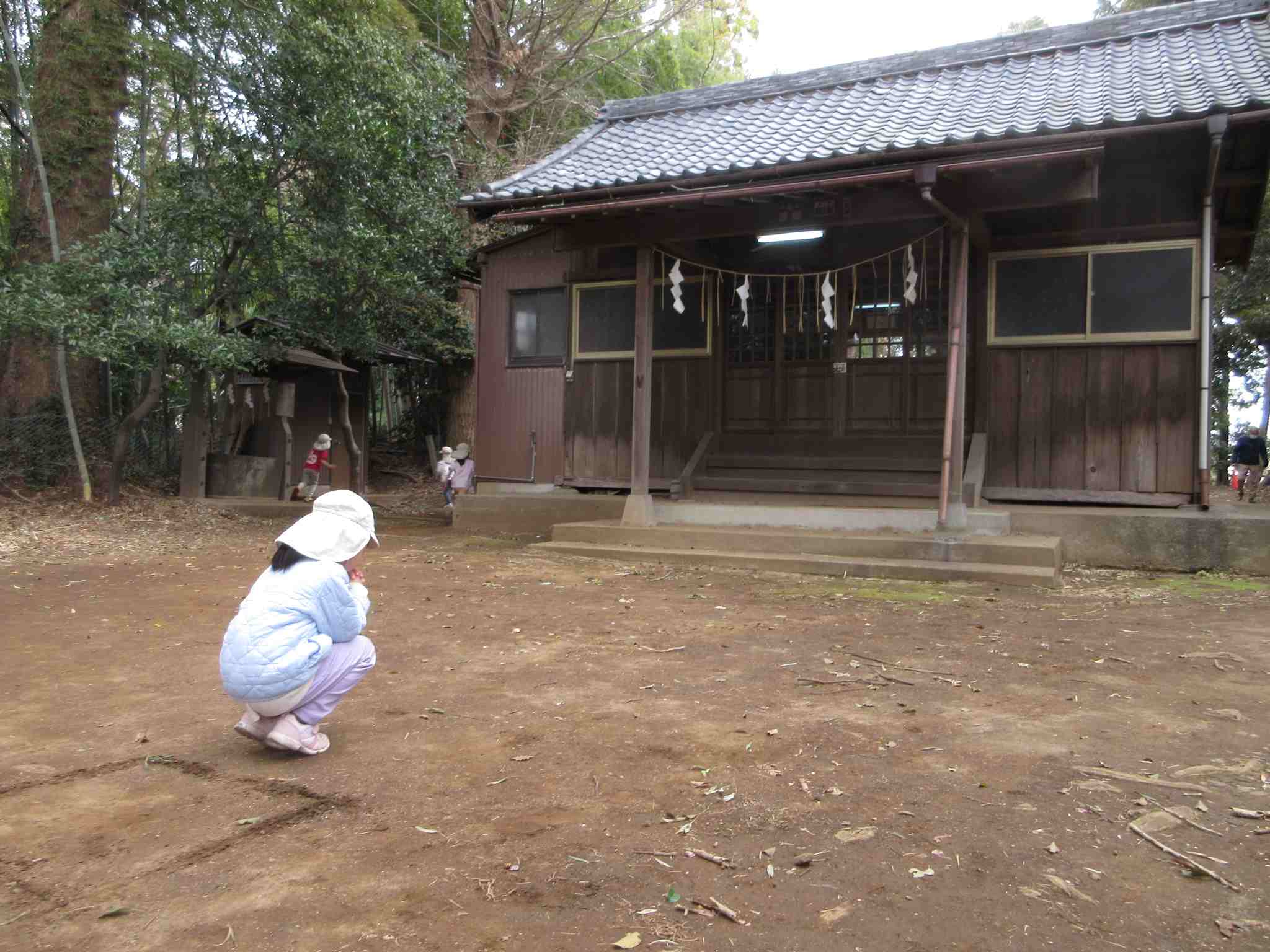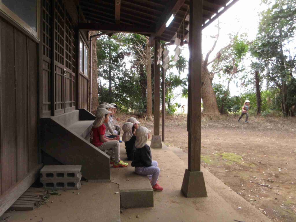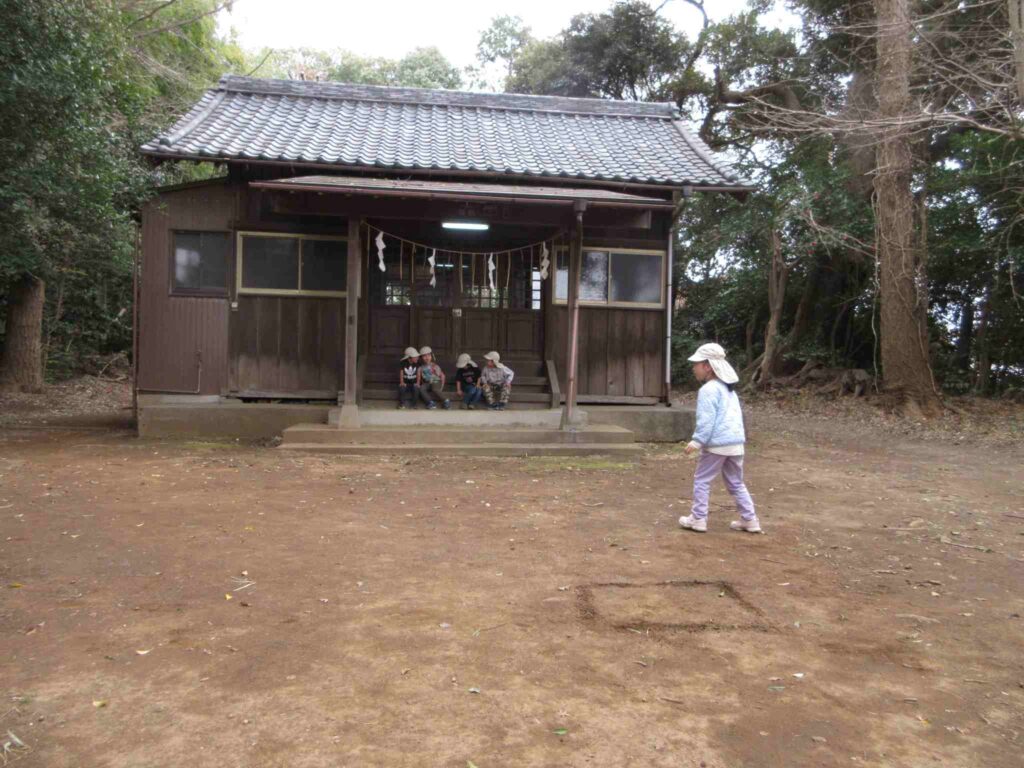 (上級生の)外出組10人は、歩いて子安神社へ。今年度、最初で最後の「四角踏み(簡易の缶けり)」をやるために。