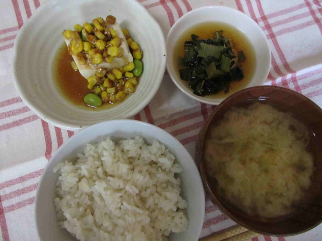 ・五分つきごはん ・冷奴(コーンと枝豆のナムルのせ) ・キャベツのおみそ汁 ・小松菜と桜えびのさっと煮