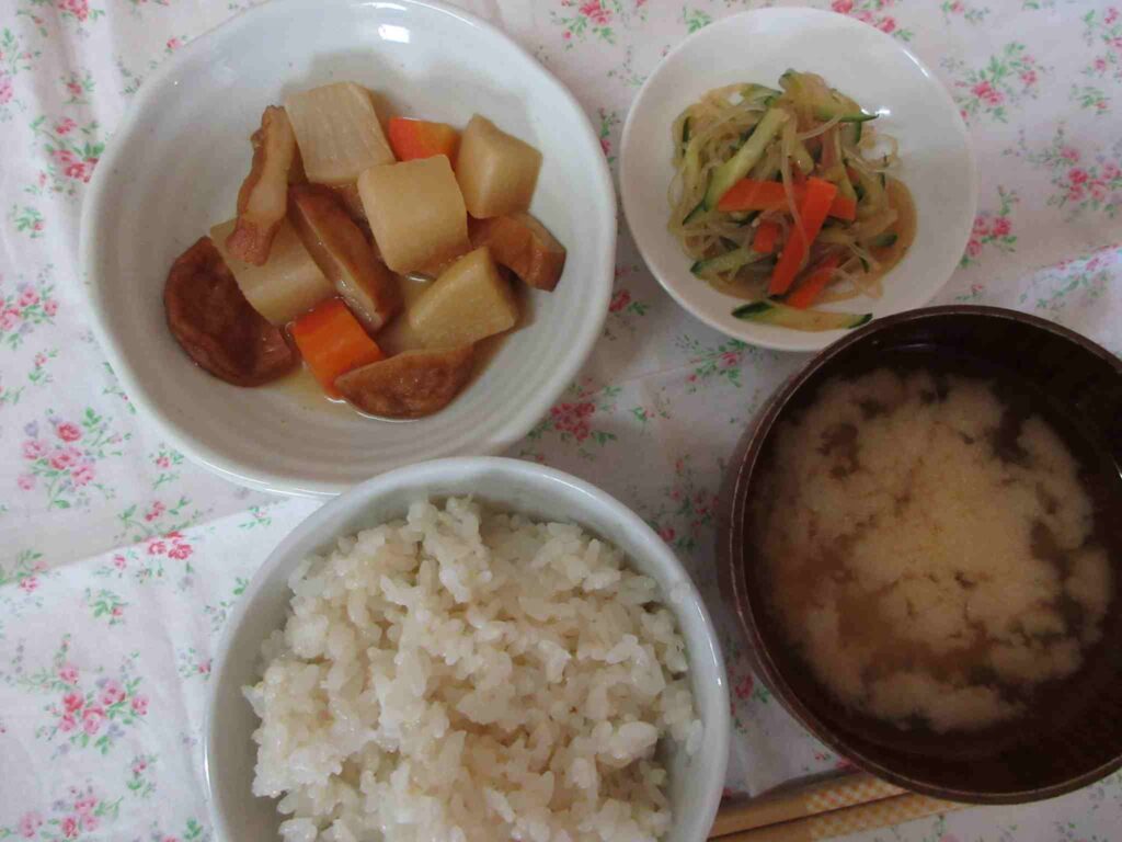 ・五分つきごはん ・さつまあげと根菜(大根・人参)の煮物 ・コーンと枝豆のおみそ汁 ・春雨ときゅうりの和風サラダ