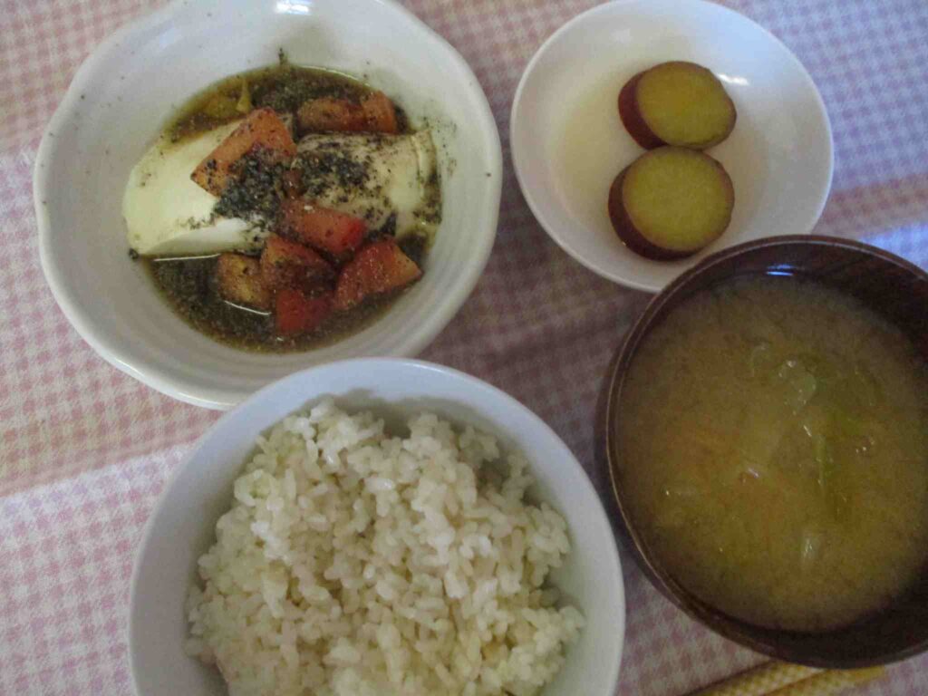 ・五分つきごはん ・トマトのゴマゴマ和えのせ冷奴 ・白菜のおみそ汁 ・さつまいものレモン煮