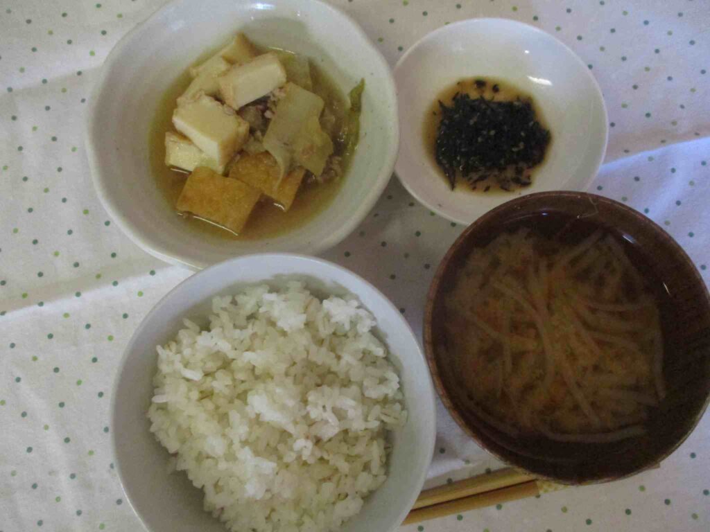 ・五分つきごはん ・厚揚げと白菜のそぼろ煮 ・もやしのおみそ汁 ・ひじきの甘辛煮