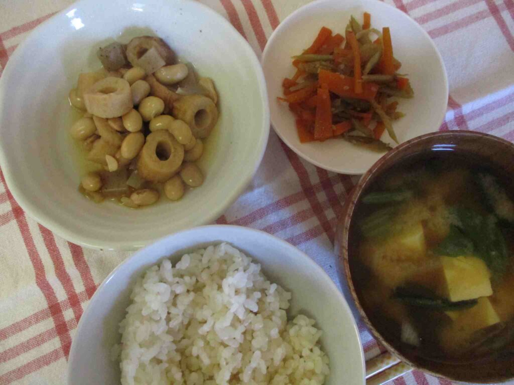 ・五分つきごはん ・ちくわ・大豆・こんにゃくの煮物 ・豆腐・玉ねぎ・ほうれん草のおみそ汁 ・きんぴらごぼう