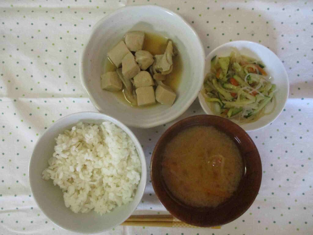 ・麦ごはん ・高野豆腐とまいたけの煮物 ・切り干し大根とにんじんのおみそ汁 ・きゅうりと春雨の和風サラダ