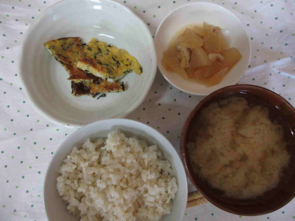 ・五分つきごはん ・ひじき入り卵焼き ・まいたけのおみそ汁 ・油あげと大根の煮びたし