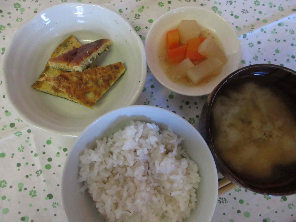 ・麦ごはん ・青のり入り卵焼き ・キャベツのおみそ汁 ・大根とにんじんのごま煮